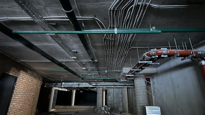 - В паркінгу практично завершено монтаж системи димовидалення, вентиляції та пожежогасіння, а також на 95% готовий індивідуальний тепловий пункт. Триває підготовка до заливання стяжки.