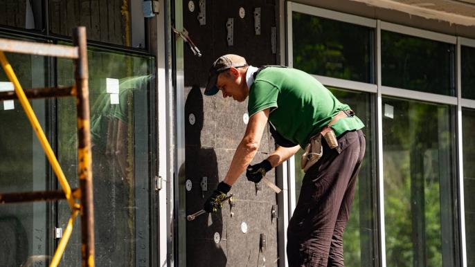 - на 97% виконано роботи по влаштуванню навісного вентильованого фасаду та на 60% - по монтажу вентильованого фасаду першого поверху;
