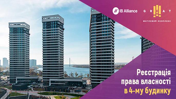 Як повідомили СтройОбзор у компанії IB Alliance у житловому комплексі Great, який зводиться в Дарницькому районі Києва компаніями IB Alliance та РІЕЛ, з 10 січня 2024 року починається реєстрація права власності для інвесторів 4-го будинку, що має адресу Дніпровська Набережна, 15-Ж.