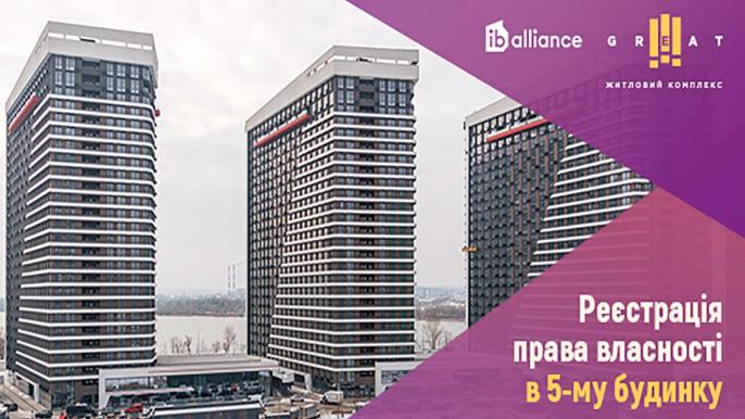 Як повідомили СтройОбзор у компанії IB Alliance у житловому комплексі Great, який зводиться в Дарницькому районі Києва компаніями IB Alliance та РІЕЛ, з 5 лютого 2024 року починається реєстрація права власності для інвесторів 5-го будинку, що має адресу Дніпровська Набережна, 15-Є.