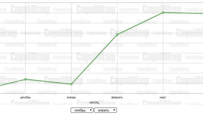 Согласно данным графиков СтройОбзора, цена в апреле, по сравнению с первым месяцем весны, опустилась на 0,2% и составила 29 972 грн. за кв. м (в марте – 30 020 грн. за кв. м).