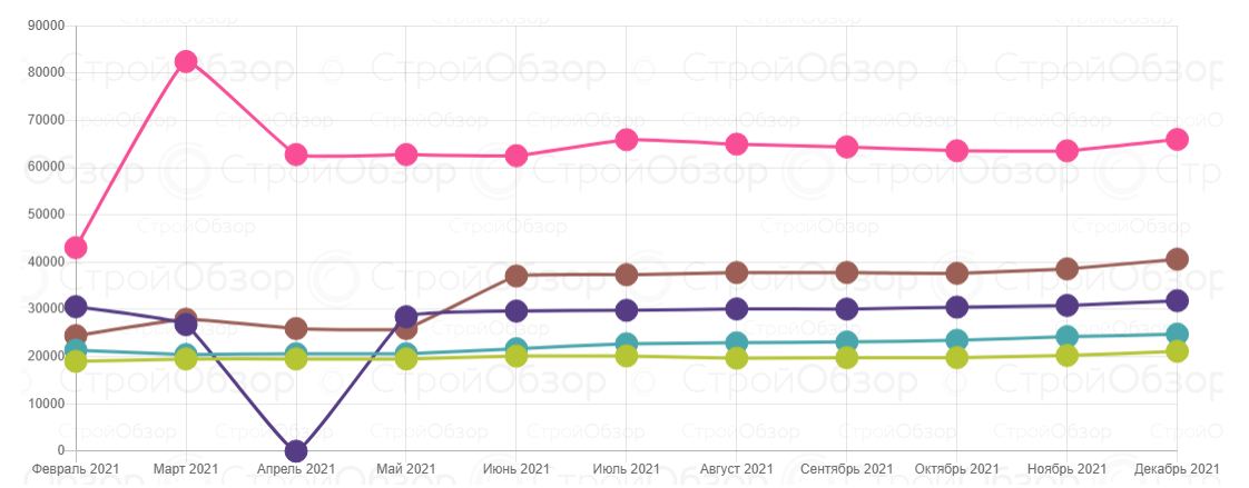 Общий график стоимости квадратного метра по классам показывает, что в этом месяце цены больше всего изменились в классах «эконом», «бизнес» и «премиум». В «комфорте» и «де-люксе» стоимость была менее изменчивой.