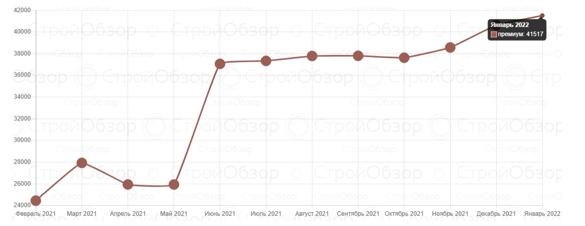 Согласно данным графиков СтройОбзора, цена в первый месяц года поднялась на 5% и составила 34 400 грн. за кв. м. (цена в ноябре – 32 700 грн. за кв. м.).