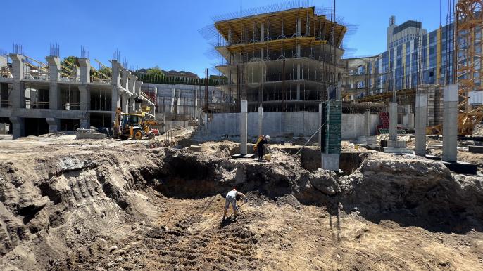 • Роботи 2-го етапу нарощування стилобату вийшли на зовнішні межі (осі) плями забудови. триває розробка ґрунту та влаштування фундаменту — бетонування основ під колони та стіни, армування та бетонування каркасів колон.
