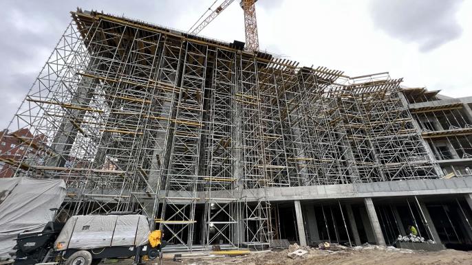 Роботи зі з'єднання стилобату із висотною частиною вже на фінішному етапі. приступили до виконання плити покриття останнього поверху — даху стилобату. вже завершено найскладнішу частину — над вхідною групою забетоновано 4-метрову консоль, що на висоті 20м. спирається на колони. наступним етапом буде влаштування пирога експлуатованої покрівлі.