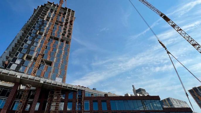 - Вежа: Бетонуємо 26 поверх моноліту над 0 рівнем (дах стилобату). Кам'яна кладка зовнішніх стін – 21-22 поверхні, міжквартирних перегородок – 12, вентканалів – по 17. Скління – по 20 поверх. Ніші під зовнішні блоки кондиціонерів − по 7. Монтаж консолей та підсистеми нвф − по 22 поверх. базальтовий утеплювач – по 15.Налаштування пожежного водопроводу завершується на 2-6 поверхах, підготовчі роботи − 7-16.