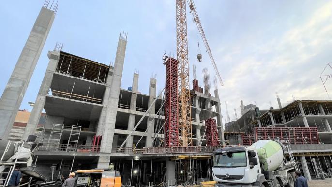 - завершено влаштування основних фундаментів та вертикальних елементів цокольного рівня стилобату (крім ділянок під розміщення крана та 2-ї кругової рампи паркінгу),