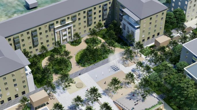 На фото видно, что появится много лавочек, фонтаны, будет сделано озеленение.