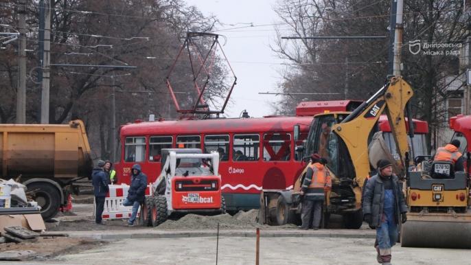 У Дніпрі триває капітальний ремонт трамвайного переїзду на перехресті просп. Лесі Українки та бульв. Батальйону Дніпро.