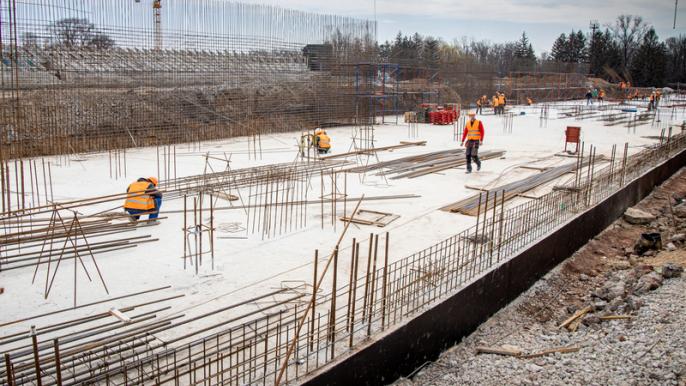 Долгое время стадион стоял заброшенный. Трибуны - в аварийном состоянии. Сейчас подрядчики начали с котлованов под трибуны. Заливают фундаменты, устраивают бетонные основания, монтируют металлические каркасы. Трибуны рассчитаны на 19 тыс. зрителей.