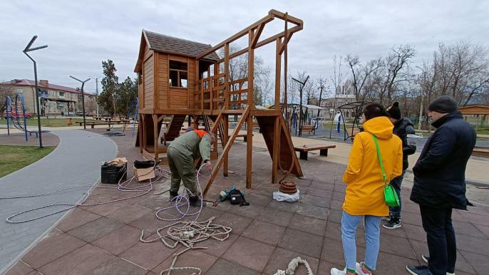 Зокрема, у сквері на гойдалках замінили гнізда та встановили нові елементи кріплень (ланцюги), у зоні воркауту встановили нові елементи кріплень канату та змонтували канат, біля дитячого дерев’яного будиночка замінили канат та встановили нову плетену мотузкову сітку, попідкручували кріплення на гірках та всіх інших об’єктах скверу.