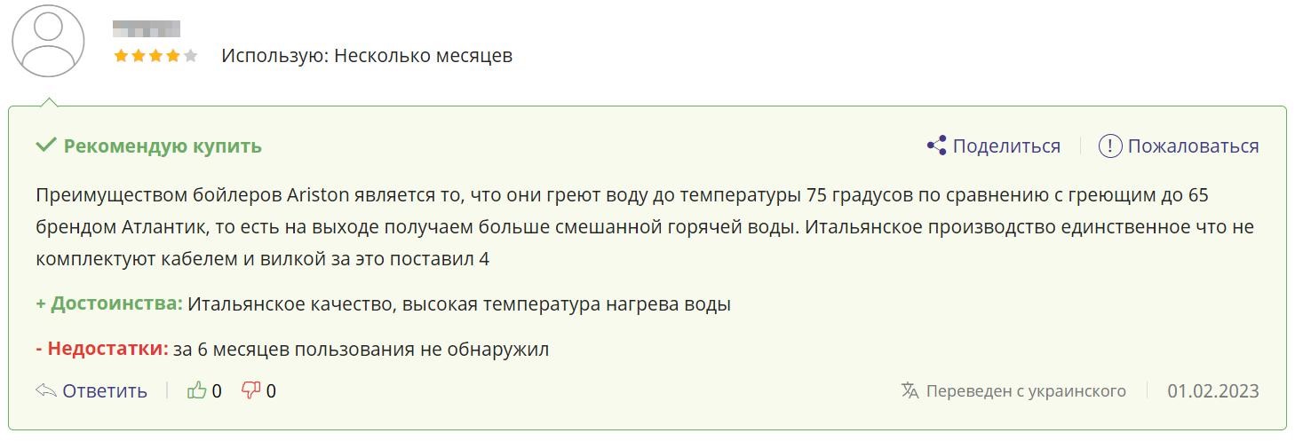 Например, в отзыве о модели Ariston SG1 80 V человек не скрывает свою радость, что наконец-то купил нормальный бойлер вместо прошлого недоразумения и хвалит его за итальянское качество: