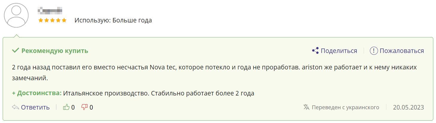 Таких отзывов много, поэтому можно однозначно сказать, что Ariston – один из лучших брендов на рынке водонагревателей.