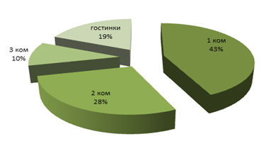 Об этом СтройОбзору сообщили в службе маркетинга компании «Жилстрой-2» по результатам анализа рынка аренды вторичной жилой недвижимости по г. Харькову за минувший год. Наибольшим спросом пользовались однокомнатные квартиры, далее двух комнатные и возрос спрос на комнаты гостиничного типа (рис.).