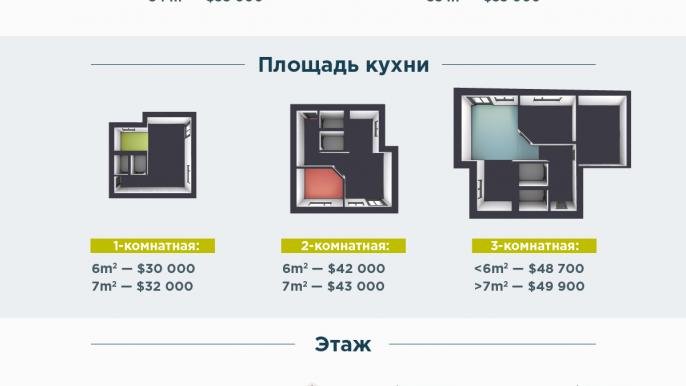 Еще одна характеристика, пожертвовать которой даже легче, чем площадью всей квартиры, – размер кухни. Однушка с кухней 6 кв. м будет стоить в среднем $30 000, двушка - $42 000 и трешка - $48 700. Те же квартиры с кухнями 7 кв. м обойдутся дороже: $32 000, $43 000 и $49 900 соответственно.