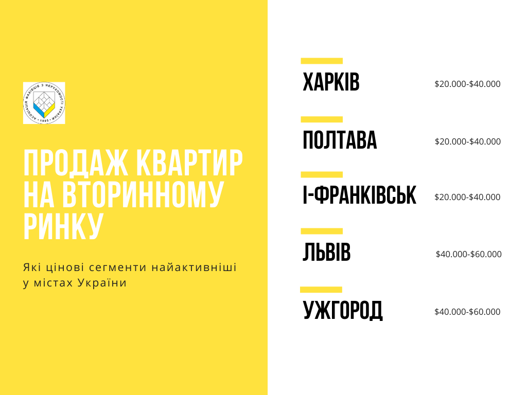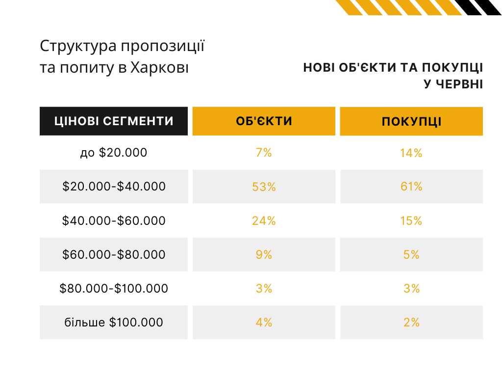 В июне 2023 года на вторичном рынке продажи квартир в Харькове самым массовым остался ценовой сегмент от $20 тыс. до $40 тыс. В этом диапазоне в течение прошлого месяца на рынок поступили 53% новых квартир и 61% новых покупателей (для сравнения, во Львове только 6% новых квартир).