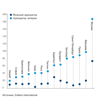 Разница между арендной платой для якорных и арендаторов галереи в Центральной и Восточной Европе, которая существенно отличается в зависимости от рынка, представлена на графике.