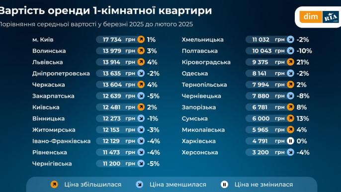 В марте 2025 года средняя стоимость аренды однокомнатной квартиры в Харькове составила 4 791 грн, что, по данным сервиса Dom.Ria, не изменилось по сравнению с февралем. Это — одна из самых низких цен на аренду в Украине, уступающая только Херсону, где средняя вартість становила 3 200 грн.