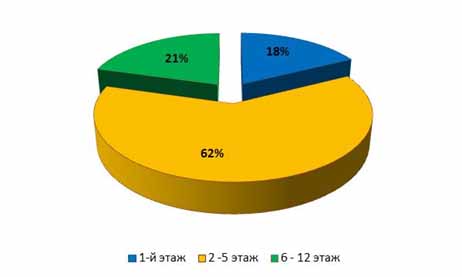 В структуре предложения преобладает доля "гостинок", расположенных на 2 - 5 этажах – 62%; на 6-12 этажах – 21%.  "Гостинки", расположенные на 1-х этажах, составили 18% (рис. 1).