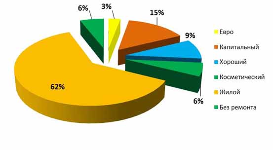 Наибольшую долю предложения на рынке продажи вторичной многоэтажной жилой недвижимости в сегменте квартир гостиничного типа во 2 квартале 2015 года представляли "гостинки" в "жилом состоянии" – 62 %, наименьшая доля предложения зафиксирована на квартиры гостиничного типа с евроремонтом  - 3 % (рис. 2).