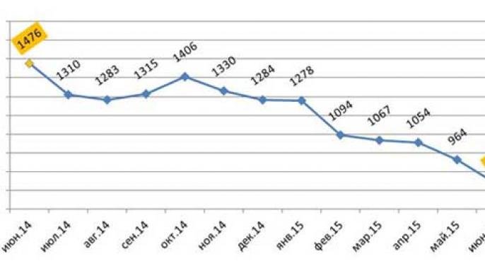 За год, с июня 2014 по июнь 2015, средняя цена предложения на рынке объектов торговли снизилась с 1476 дол. США/кв. м до 837 дол. США/кв. м, что составило 43,3%  (рис. 1).
