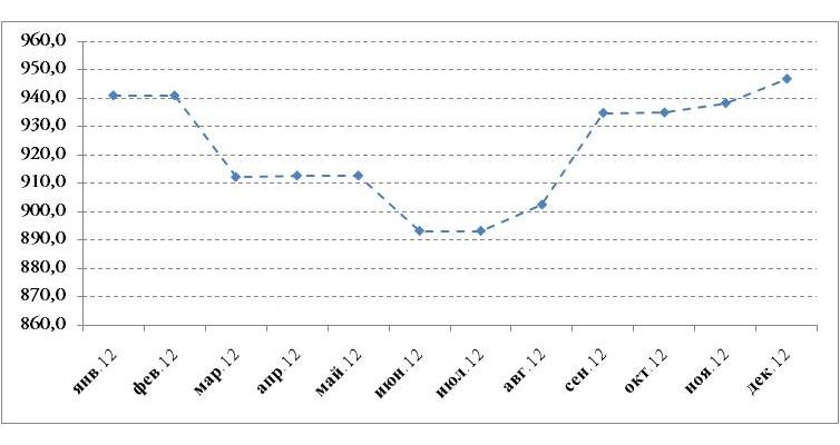 Средняя стоимость квадратного метра на первичном рынке недвижимости Харькова в декабре 2012 года составила 947 долл. США или 7670 грн. (рис. 5). Годовой рост средневзвешенного ценового показателя, рассчитанного с учетом структуры предложения, составил менее 1 %.