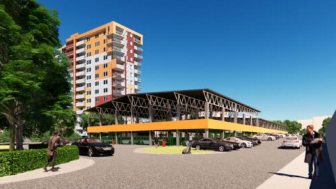 Согласно проекту, паркинг в комплексе отдельно стоящий, двухуровневый, крытый. Рассчитан на 211 мест. На первом уровне — 114, на втором — 97. Ширина паркомест первого уровня — 2,7 на 5 метров, второго — 2,5 на 5 метров. Ввод паркинга в эксплуатацию запланирован на декабрь 2020 года.