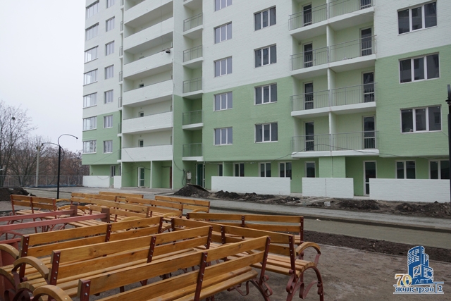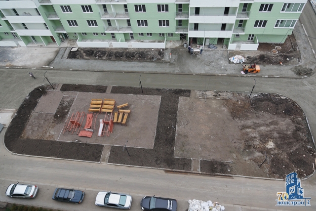 Выполняются работы по благоустройству придомовой территории. На стройплощадку доставлены скамейки и детская площадка. Подготовлены к асфальтированию тротуары и дорога. На этой неделе планируется выполнить основную часть работ по укладке асфальта и посадить во дворе саженцы туй.