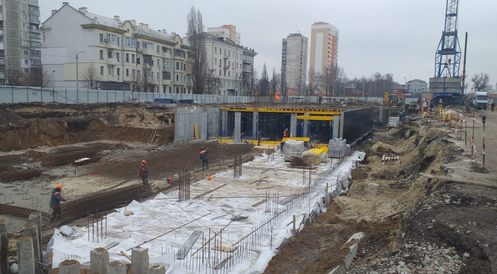 На строительной площадке ЖК «Спортивный» установлен башенный кран для строительства жилого комплекса. Проводятся работы по устройству монолитного перекрытия цокольного этажа второй секции и работы по устройству ростверков третьей секции.