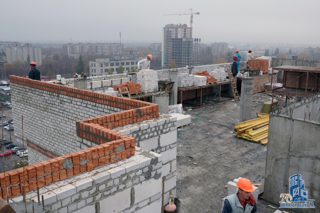 Каменщики практически завершили кладку наружных стен технического этажа. Завершается кладка внутренних перегородок на 6-м этаже, параллельно ведется кладка на 4-м этаже.