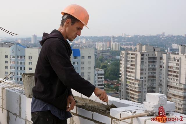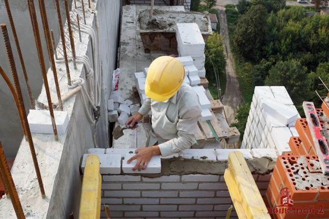 Каменщики выполнили половину объема работ по кладке наружных стен 18-го этажа. Продолжается кладка внутренних перегородок на 14-м этаже, начались работы на 15-м этаже.