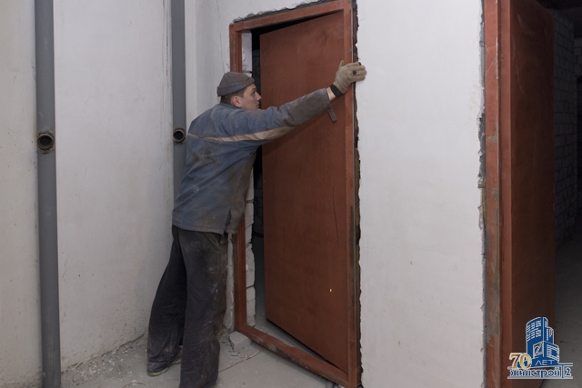 В местах общего пользования установлены деревянные двери на 18-ти этажах. Входные металлические двери в квартиры установлены на 2-3-м этажах, сейчас ведутся работы на 4-м этаже. Установка окон производится на 19-м этаже.