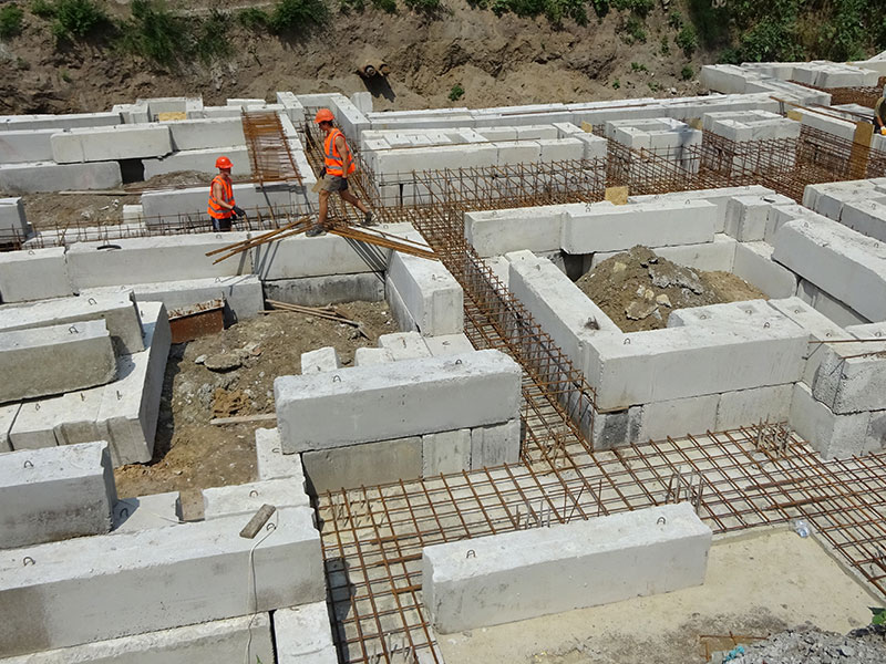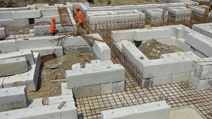 Дом 1(секция А) – кладутся плиты перекрытия подвала.