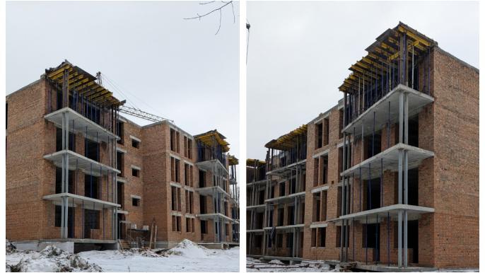 Идет изготовление и монтаж навеса входной группы, заканчивается монтаж колонн балконов.