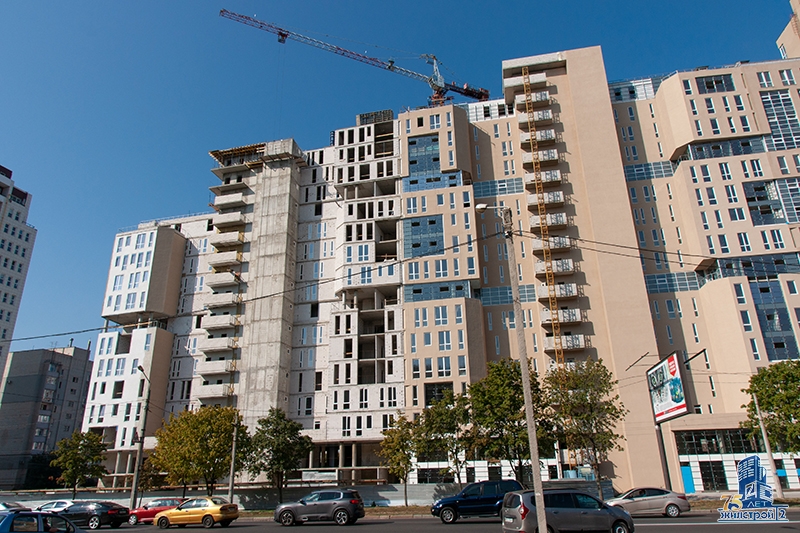 - В 5-й секции завершаются работы по устройству перекрытия над 16-м этажом. На 17-м этаже бетонируются вертикальные конструкции, ведется кладка наружных стен. На 13-м этаже завершается кладка внутренних перегородок. Продолжается утепление и отделка фасада.