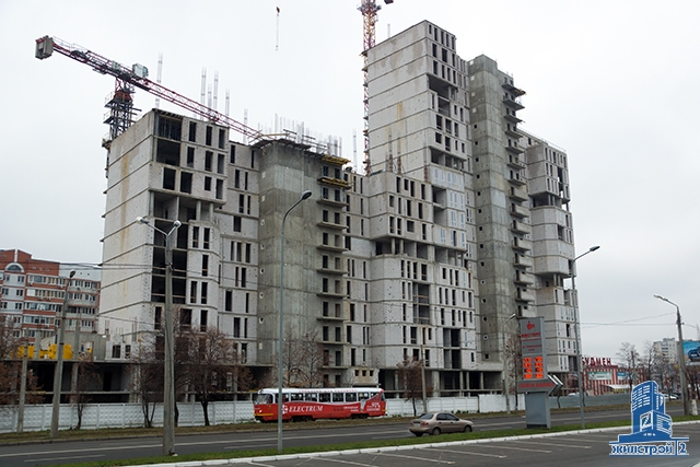 Во 2-й секции выполнены работы по устройству перекрытия над 11-м этажом. На 12-м этаже бетонируются вертикальные конструкции. Кладка внутренних перегородок ведется на 10-м этаже.