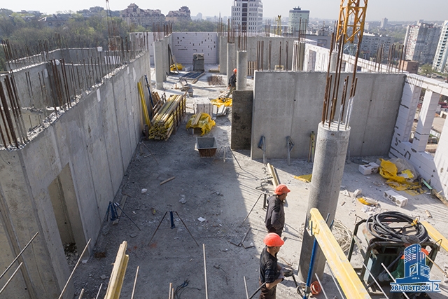 Во 2-й секции на 4-м этаже забетонированы вертикальные конструкции, выполнена половина объема кладки наружных стен, ведутся работы по устройству перекрытия над 4-м этажом.