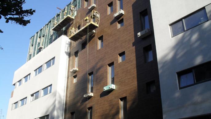 Для устройства вентилируемого фасада жилого комплекса «Карат» компания ТММ использовала облицовочные панели голландского концерна Trespa. Вентилируемый фасад, зачастую применяемый в реализации проектов высокого класса, обладает повышенной стойкостью к атмосферным воздействиям и создает здоровый микроклимат в здании.