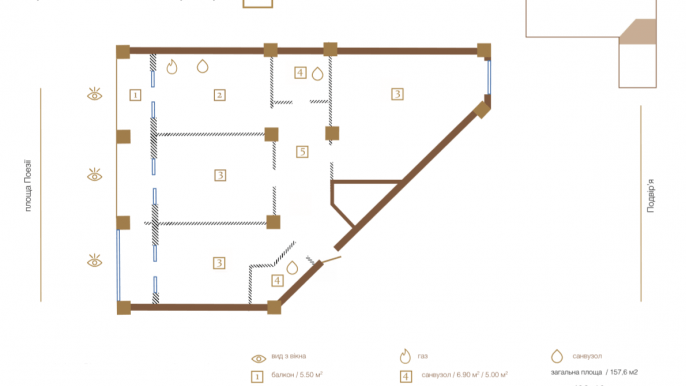 Планування трикімнатної квартири L2 Секції 2 у клубному будинку преміум-класу Leonardo town в центрі Харкова.