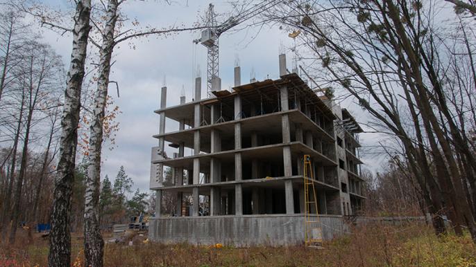 Триває монтаж перекриття над п’ятим поверхом. Завершено монтаж вертикальних конструкцій п’ятого поверху. Розпочато монтаж вертикальних конструкцій шостого поверху. Триває кладка зовнішніх стін третього поверху, на другому поверсі кладка зовнішніх стін завершена.