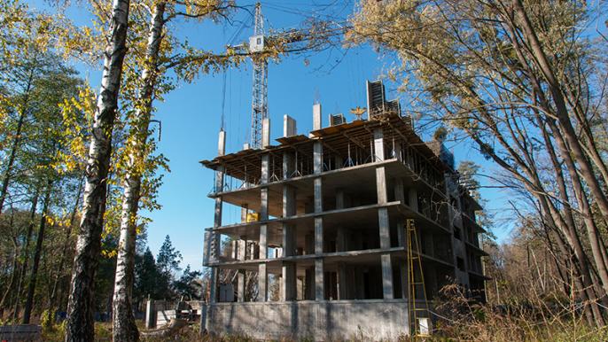 Завершено монтаж перекриття над четвертим поверхом. Завершується монтаж вертикальних конструкцій п’ятого поверху. Розпочато монтаж перекриття п’ятого поверху. Триває кладка зовнішніх стін другого поверху.