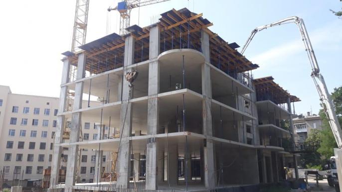 Как сообщили СтройОбзору в компании MARSHAL DEVELOPMENT, на строительной площадке ЖК «Спортивный» проводятся работы по устройству вертикальных элементов колонн и лифтовой, монтаж опалубки плиты перекрытия восьмого этажа третьей секции.