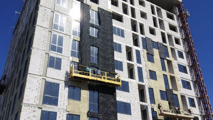 Как сообщили СтройОбзору в компании MARSHAL DEVELOPMENT на строительной площадке ЖК «Спортивный» проводятся работы по утеплению фасада первой секции жилого комплекса «Спортивный».