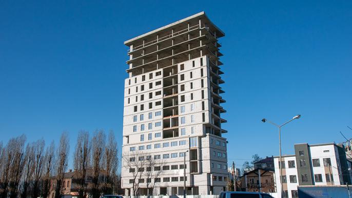 - В первой секции комплекса строители устанавливают перекрытие над технической надстройкой, расположенной над последним шестнадцатом этажом. Каменщики кладут внутренние стены на десятом и одиннадцатом этажах.