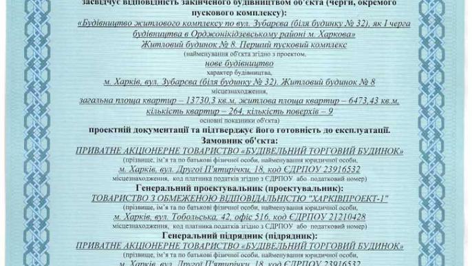 Дом уже получил Сертификат готовности объекта, также зданию присвоен почтовый адрес на сессии исполнительного комитета Харьковского городского совета.