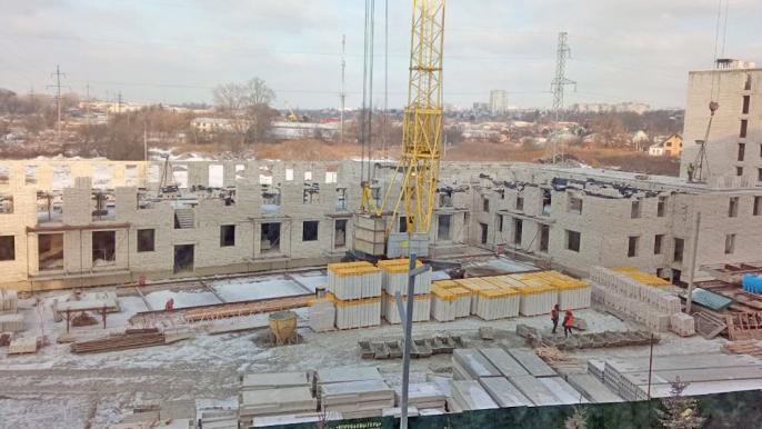 В первой секции строители заканчивают кладку наружных стен 2-го этажа, а во второй – завершается кладка наружных и внутренних стен 2-го этажа, и рабочие уже начали его перекрывать.