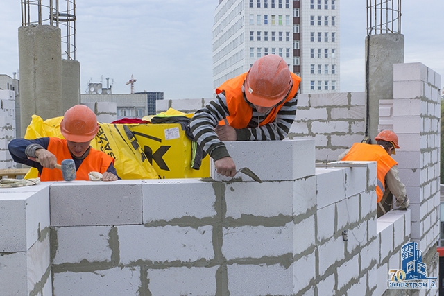 Каменщики завершили кладку внутренних перегородок на 2-м этаже и приступили к работам на 3-м этаже. Завтра начнется кладка внутренних перегородок на 4-м этаже.