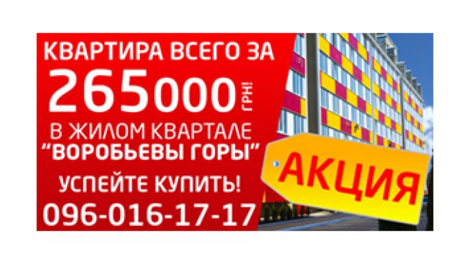 Успейте купить квартиру в ЖК «Воробьевы горы» всего за 265 000 грн! Акция действует только до 30 июня! Звоните прямо сейчас по телефонам: 066-57-57-57-0; 096-016-17-17 и записывайтесь на просмотр. Успейте приобрести современную квартиру европейского класса в Новострое всего за 265 000 грн!