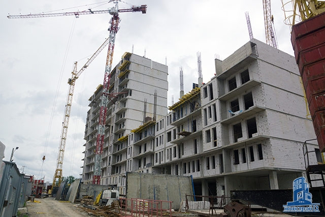 Во 2-й секции на 5-м этаже завершаются работы по бетонированию вертикальных конструкции, кладке наружных стен и устройству перекрытия над 5-м этажом. Кладка внутренних перегородок ведется на 4-м этаже.