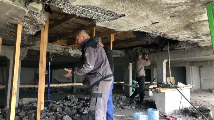 «Житлобуд-1» у Немишлянському районі веде роботи з демонтажу аварійних плит перекриття на технічному поверсі та укріплення стелі у житловому будинку по вул. Амосова. Також робітники відновлюють підлогу та внутрішні стіни у квартирах мешканців, які були пошкоджені через ворожі обстріли.